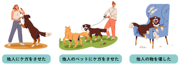 ペットと暮らしていると、トラブルを起こすことや巻き込まれることがあります。ペットが他人にケガをさせてしまったり、モノを壊したりしてしまった時は飼い主の責任になります。ケガをさせてしまった相手への治療費や慰謝料、壊した物の修理・買い替え費用等は飼い主が支払わなければなりません。以下に代表的な事例を紹介します。